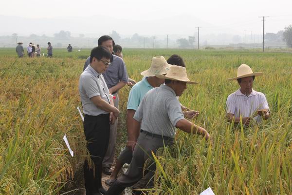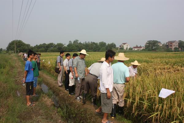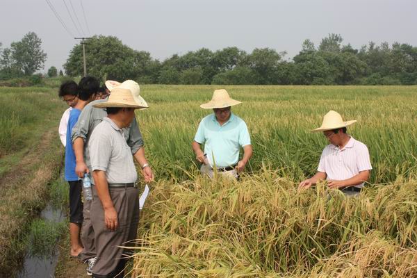 首先,研究人員趙松濤向公司領導班子及研究院領導詳細介紹了基地的規模、日常管理情況,并重點查看了秈稻(粳稻)品比材料。嚴輝民總經理、王才林院長、仲維功研究員不時的停下腳步,就組合的農藝性狀、豐產性、抗病性、品質等方面進行了仔細察看,不時的向科研人員就相關組合親本的使用情況、目前的參試情況、研發的思路等進行了深入的交流,并就如何做好田間試驗后續工作、把握好育種方向做了具體指導。