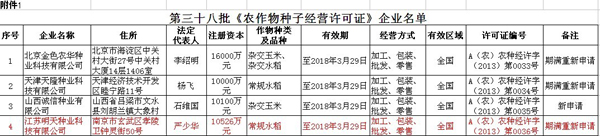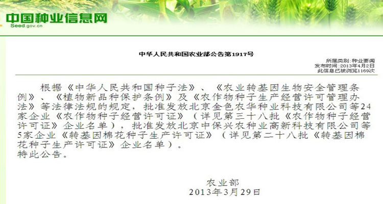 根據 2013年3月29日中華人民共和國農業部公告第1917號文,明天種業獲農業部頒發的《農作物種子經營許可證》。