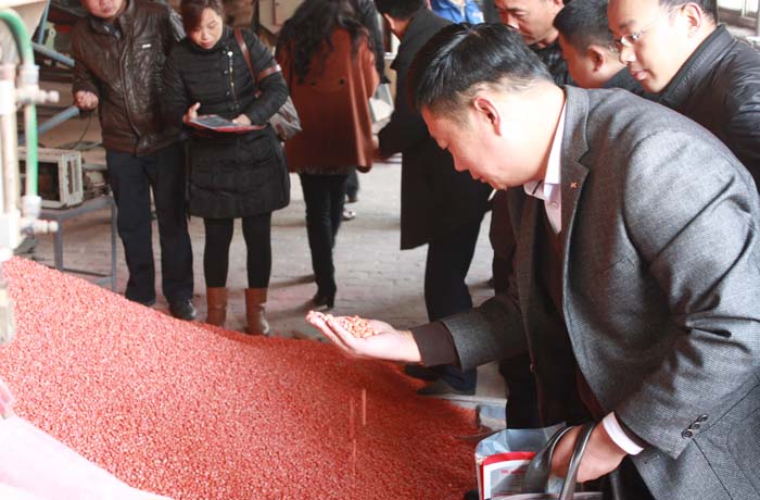 玉米加工現場,顆粒飽滿、色澤剔透,經進口包衣劑處理過的蘇玉20玉米種子受到了經銷們的一致好評。徐州新民種業的王總望著堆放整齊的玉米種,樂呵呵地說,今年的種子就算不處理,都優于往年,全能達到國家標準,但還是進行了優中選優的精選處理。綜合保障部經理王波在《玉米種子質量控制》的匯報中,向經銷商們介紹了公司的全程質量控制體系并以多項數據表明本年度玉米種子質量高于國家標準水平。