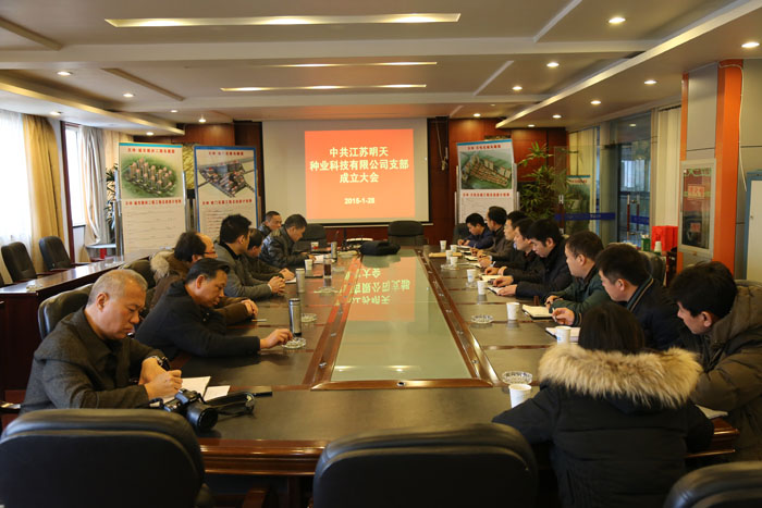 2015年1月28日,中共江蘇明天種業(yè)科技有限公司支部成立大會(huì)在江蘇天坤集團(tuán)公司會(huì)議室召開,會(huì)議宣讀了中共丹陽(yáng)開發(fā)區(qū)工委、江蘇天坤集團(tuán)黨委《關(guān)于中共江蘇明天種業(yè)科技有限公司黨支部批準(zhǔn)成立的批復(fù)》,江蘇天坤集團(tuán)總裁張立民、副總裁馬海強(qiáng)、丹陽(yáng)開發(fā)區(qū)工委組織人事局吳志江副局長(zhǎng)、公司黨支部11名黨員,1名入黨積極分子共同出席了此次會(huì)議。會(huì)議由集團(tuán)副裁馬海強(qiáng)主持。