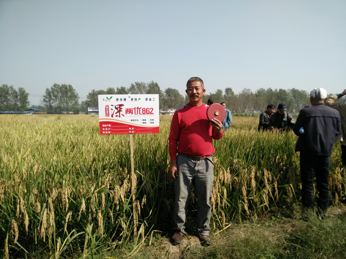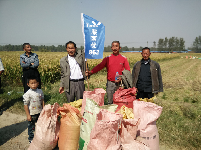 2015年10月11日中午,在安徽省六安市壽縣雙橋鎮馬方村,由江蘇明天種業科技有限公司和壽陽種業共同組織的100多人聚集于當地農戶李傳文家的深兩優862稻田觀摩測產。收割之前,看到稻田里一片片金燦燦的稻谷,每個人的臉上都洋溢著豐收的喜悅。