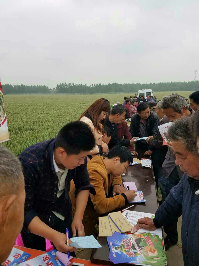 5月7日,在臨泉新農耕服務公司總經理韋創偉的帶領下,臨泉縣張營鎮鄉鎮農資經銷商劉人杰召開了臨泉首場淮麥33農民觀摩訂購會。會議開始,臨泉新農耕服務公司組織農戶進行田間觀摩并講解,淮麥33根系發達,分蘗力強,莖稈粗壯柔韌性好,籽粒飽滿,長相清秀等特點征服了在場農戶的眼球,觀摩后農戶紛紛掏錢進行現場預定,現場到會24人,成功預定4680斤淮麥33種子,開辟小麥種預定銷售的先河,韋總表示,接下來會召開了100場農民預定會,實現100萬斤預定銷量。安徽懷遠雙橋鎮實現單場農民會訂購數量3萬多斤;安徽淮北連續三天召開近10場會議,預定量達10萬斤;泗縣更是遍地開花,逐個鄉鎮召開預定會,將種子銷售在田間地頭進行。