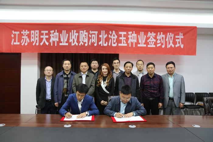近日,江蘇明天種業(yè)科技股份有限公司收購河北滄玉種業(yè)有限公司整體科研簽約儀式在公司三樓會議室舉行,明天種業(yè)董事長胡玉萍、董事陳鎖連、劉偉,總經理嚴輝民、副總楊地龍、胡玉成及河北滄玉種業(yè)總經理師洪飛出席了本次簽約儀式。