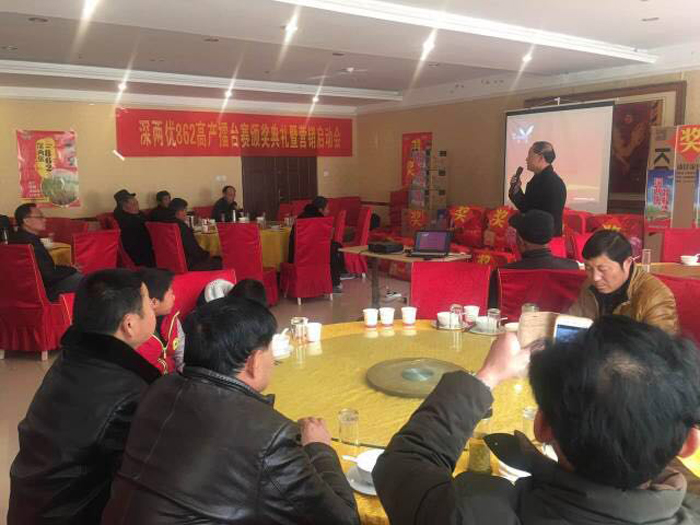 2016年11月10日和11日,江蘇明天種業(yè)科技股份有限公司分別在安徽省淮南市和壽縣召開了“深兩優(yōu)862高產(chǎn)擂臺(tái)賽頒獎(jiǎng)典禮暨營(yíng)銷啟動(dòng)會(huì)”。會(huì)議議題:總結(jié)深兩優(yōu)862 2016年品種表現(xiàn)、深兩優(yōu)862品種優(yōu)勢(shì)分析、高產(chǎn)擂臺(tái)賽頒獎(jiǎng)典禮和下一年度深兩優(yōu)862高產(chǎn)擂臺(tái)賽規(guī)則。