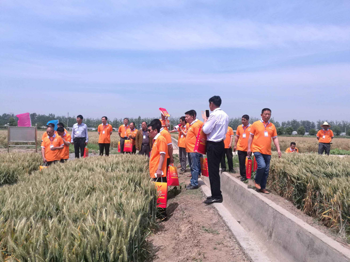 24日上午10點,觀摩活動正式開始,來自蘇北區(qū)域的經(jīng)銷商團隊們在睢寧基地的谷成林老師和常規(guī)稻麥部片區(qū)經(jīng)理汪鵬程的帶領下,走進淮麥33原種繁殖田,近距離觀察淮麥33的長勢長相,同時常規(guī)稻麥部副經(jīng)理韓國標深入講解我公司對淮麥33提純復壯所做出的努力及取得的成績。淮麥33,植株矮壯,第一節(jié)間短,秸稈厚實、抗倒能力強,長相清秀、穗頭大,分蘗能力強、抗寒性好等一系列優(yōu)良特點。與會人員紛紛表示淮麥33的優(yōu)點非常突出,每穗粒數(shù)和千粒重也都非常高,豐產(chǎn)潛力性強。觀摩活動結(jié)束后,參會人員排著整齊的隊伍齊聚廣場大聲高呼“要想糧食堆成山,就種淮麥33。”的響亮口號,將現(xiàn)場氣氛推向高潮。