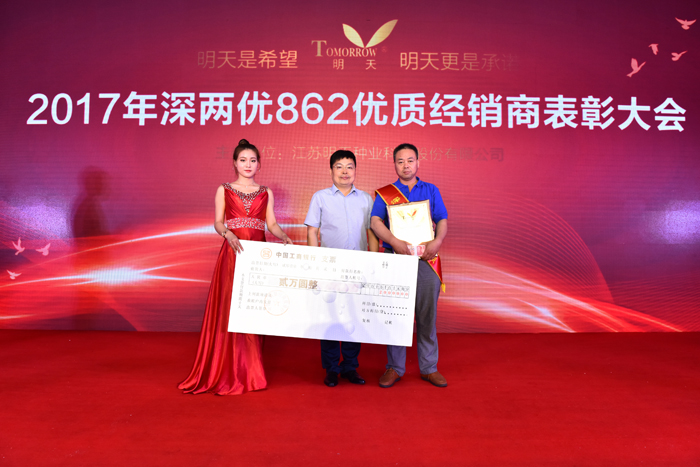 在接下來的頒獎典禮中,首先是對在今年深兩優862推廣上表現優異的50位鄉鎮零售商進行頒獎,以表彰他們今年在深兩優862推廣、銷售上付出的努力,鼓勵他們在下一年的銷售中更上一層樓,其中零售商代表安徽天長李先家、江蘇睢寧韓兵華分享了深兩優862在當地的田間表現、創新的推廣模式等,充分闡述了深兩優862“多穗矮稈、易種好管”的品種特點,精彩之處贏得了臺下一陣陣熱烈的掌聲。伴隨著一段賞心悅目的表演過后,頒發的是江蘇明天種業最高榮譽獎項--“明天之星”,獲獎的6位縣級經銷商在激昂的音樂中依次登上領獎臺,全場爆發出雷鳴般的掌聲,隨后由縣級經銷商代表安徽壽縣鮑廣文、江蘇盱眙喬澤華分別就深兩優862推廣心得、在田間的強勢表現以及與江蘇明天種業合作過程等作了分享,強調深兩優862“穩產、高產、抗逆性強”的特點已經深入人心,并盛贊與江蘇明天種業的合作更是“安心、放心、舒心”。伴隨著美妙的旋律,本次會議圓滿落幕,正如歌聲中所唱“讓我們期待著明天會更好”。