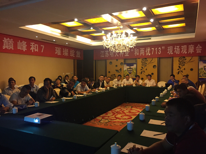 田間觀摩結(jié)束后,在宿遷江山大酒店會(huì)議室召開了現(xiàn)場(chǎng)會(huì)議,會(huì)議由雜交水稻部楊海波經(jīng)理主持,江蘇片區(qū)經(jīng)理喬昌寶首先向大家介紹了和兩優(yōu)713的品種特點(diǎn)、品種優(yōu)勢(shì)及配套的高產(chǎn)栽培技術(shù),隨后宿遷市寶豐種業(yè)張?zhí)密娊?jīng)理就和兩優(yōu)713在宿遷市的優(yōu)異表現(xiàn)進(jìn)行分享,并對(duì)和兩優(yōu)713的品種特點(diǎn)及市場(chǎng)推廣前景發(fā)表了看法。最后雜交水稻部楊海波經(jīng)理對(duì)公司雜交水稻的品種選育方向和品種布局做了詳細(xì)介紹。