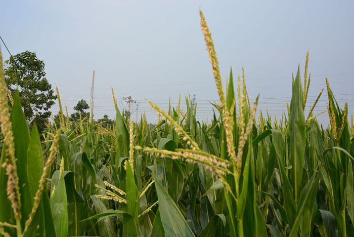 2、小雄穗。明天695雄穗分支7個左右,典型中小型雄穗。其主軸長,散粉時間長,花粉量大,利于在陰雨寡照和高溫干旱下規避結實風險,獲得較高產量。