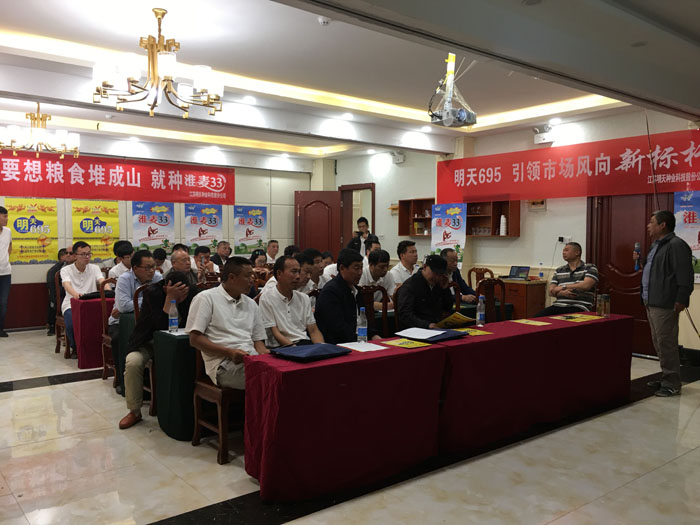 在室內會議,明天種業公司陳浩經理向參會的各位經銷商詳細介紹了淮麥33的品種特性、在各地的優異表現、公司的宣傳、市場管控等方面的內容。零售商代表也在會上分享了各自成功的推廣經驗,與會者紛紛表示對于淮麥33這么優秀的品種還要加大推廣力度,提高淮麥33的知名度和市場占有率,讓更多的農戶感受到種植淮麥33帶來的喜悅。