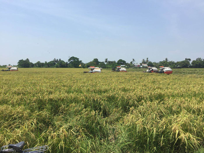 盡管當天緬甸實時氣溫高達38℃,但依然無法阻擋大家現場參觀緬甸合資公司生產基地的熱情。正值當地水稻旱季制種收獲季節,在基地工作人員的帶領下,大家興致勃勃地一起觀摩了機械化收獲雜交水稻種子。看到一臺臺收割機在隨風搖曳生姿的稻田中來回穿梭,然后再將一顆顆金燦燦的種子運輸到倉庫曬場,豐收的喜悅洋溢在在場每一個人的臉上,仿佛看到了這一顆顆滿載希望的種子為緬甸農民帶來更大的豐收,這是一個多么生動美妙的時刻!